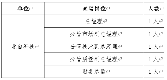 為進(jìn)一步加強(qiáng)公司干部隊(duì)伍建設(shè),激發(fā)干部隊(duì)伍活力,創(chuàng)新選人用人方式,拓寬選人用人渠道,經(jīng)黨委研究,決定對(duì)北自科技經(jīng)理層開展公開招聘?,F(xiàn)將有關(guān)事項(xiàng)通知如下: